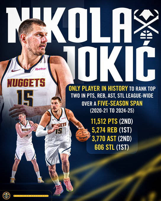 24直播网北京时间2025年8月4日,尼古拉-约基奇在过去五年间达成了一项前无古人的成就。在2020-21赛季至2024-25赛季这五年间,约基奇总得分11512分,篮板5274,助攻3770,抢断606。他...